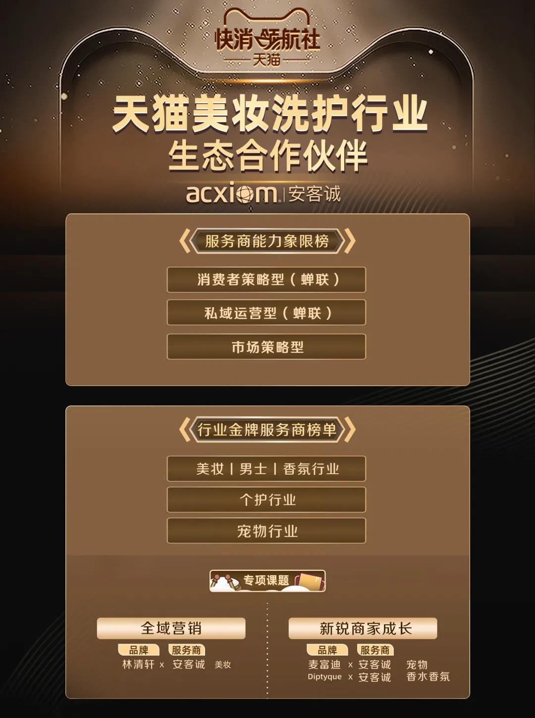 近日,天猫美妆洗护行业生态合作伙伴2021行业年度服务商排行榜单出炉,其中,安客诚荣评9项年度服务商荣誉奖项!